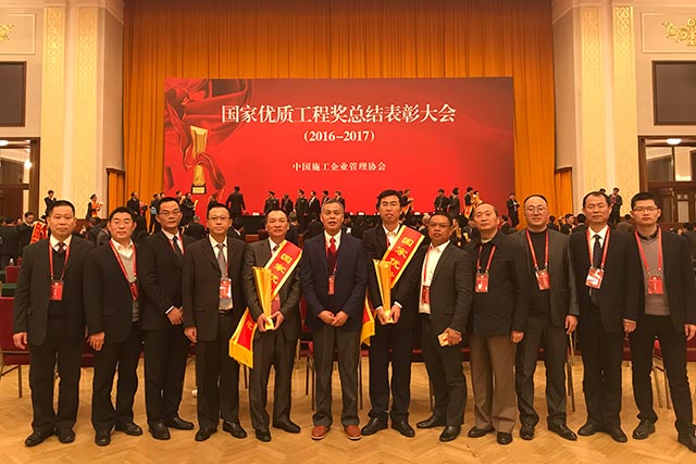 ----記金輝華集團北京人民大會堂捧杯國優(yōu)工程兩項 表彰大會合照(人民大會堂),左四為金輝華集團董事長 2017年 12月13日,由中國施工企業(yè)管理協(xié)會主辦的“2016-2017年度國家優(yōu)質工程獎總結表彰大會”在北京人民大會堂舉行。廣東金輝華集團有限公司“江門市中心醫(yī)院外科住院大樓工程”和“臺山新寧體育館及人防工程”,榮獲國家優(yōu)質工程獎兩項。 金輝華集團的業(yè)務發(fā)展始終注重質量、安全和效益