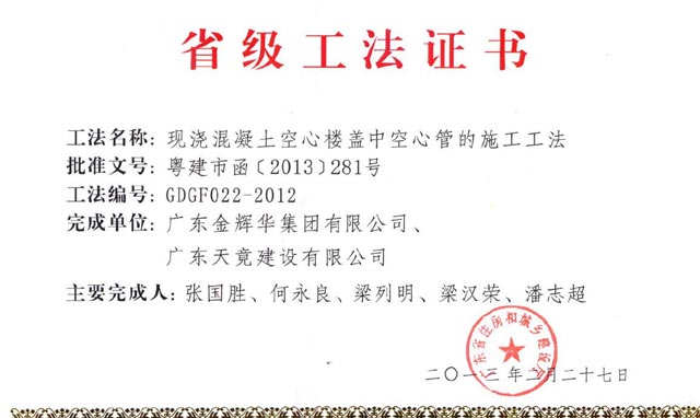 熱烈慶祝我公司工法“現澆混凝土空心樓蓋中空心管的施工工法”獲得省級工法。