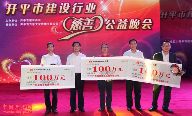 2013年3月22日,開平市建設商會主辦的“開平市建設行業慈善公益晚會”在人民公園隆重舉行。江門市住房城鄉建設局局長馬克烈,開平市黃耀雄、文彥、吳平超、張星杰等四套班子領導,我集團公司董事長張國球、總裁李甫等均出席晚會。在慈善公益晚會中,表演者帶來了豐富多彩的節目,演出涵蓋舞蹈、雜技、獨唱等,讓觀眾體會到歌聲的力量和溫情,激發大眾對公眾事業的熱忱。捐贈儀式穿插其中,我司以及耀南公司、碧桂園公司各捐