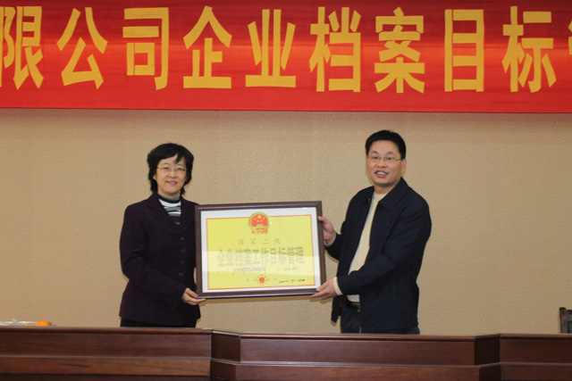 2010年12月24日上午“廣東金輝華集團有限公司企業檔案目標管理國家二級認定會”在集團技術中心會議室舉行,我司最終以88.2分的高分通過了企業檔案目標管理國家二級認定。圖為:我司接受企業檔案工作目標管理二級牌匾與會人員有江門市檔案局副局長...
