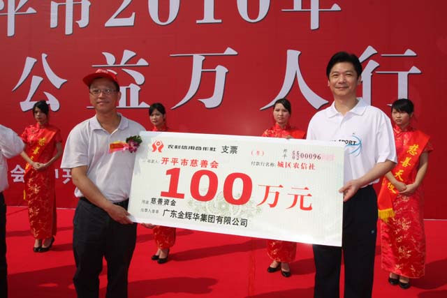 3月3日上午,2010年開平市慈善公益萬人行活動起步儀式在城市北廣場舉行。為支持慈善事業,我集團公司在慈善萬人行活動中向開平市慈善會捐贈了一百萬元,被表彰為第一批慈善事業突出貢獻的先進單位。起步儀式上,我集團公司董事長李甫向市委書記、市人大常委會主任馮立堅遞交一百萬元捐贈支票,并滿臉喜悅地從馮書記手中接過慈善紀念牌匾。多年來,金輝華集團始終以發展推動和諧,以文化促進和諧,以穩定保證和諧,主動承擔社