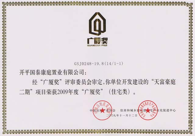 天富豪庭二期是廣東金輝華集團(tuán)有限公司與開平國泰康庭置業(yè)有限公司共同開發(fā)的住宅小區(qū),它以獨特的人文景觀及設(shè)計水平、環(huán)境質(zhì)量、功能配置、科技含量等諸多優(yōu)勢,在全國眾多參評項目中脫穎而出,這是天富豪庭全體開發(fā)者和建設(shè)者的光榮。此次天富豪庭二期入圍2009年“廣廈獎”,成為廣東開平首個獲此榮譽的房地產(chǎn)項目。